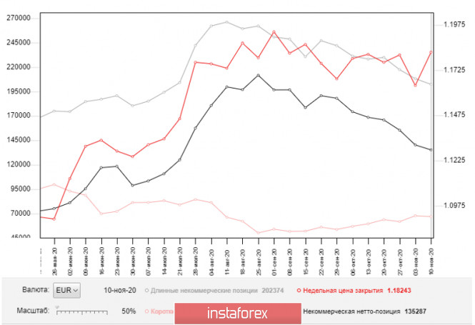 В COT отчете (Commitment of Traders) за 10 ноября было зафиксировано сокращение длинных и короткий позиций. Быки по евро придерживаются выжидательной позиции и не торопятся возвращаться в рынок даже после президентских выборов в Соединенных штатах. Но несмотря на это, покупатели рисковых активов верят в продолжение бычьего рынка, хоть и предпочитают действовать осторожно. Так, длинные некоммерческие позиции сократились с уровня 208 237, до уровня 202 374, в то время как короткие некоммерческие позиции остались практически без изменений, снизившись с уровня 67 888, до 67 087. Общая некоммерческая нетто-позиция снизилась до уровня 135 287, против 140 349 неделей ранее. Стоит обратить внимание, что дельта снижается уже 7 недель подряд, что подтверждает отсутствие желания покупателей евро идти на рынок в текущих условиях. Рост начнется только после того, как победа Джо Байдена и его намерения одарить американскую экономику очередным крупнейшим денежным пакетом помощи в размере более 2 трлн долларов США, начнут реализовываться.