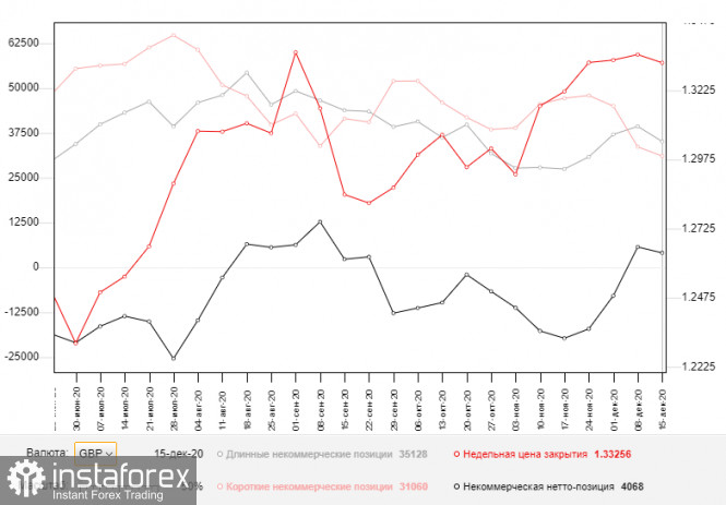 Напомню, что в COT отчетах (Commitment of Traders) за 15 декабря отмечается снижение интереса к британскому фунту, как и покупателей, так и у продавцов. Длинные некоммерческие позиции снизились с уровня 39 344 до уровня 35 128. В это же время короткие некоммерческие позиции снизились с уровня 33 634 до уровня 31 060. В результате этого некоммерческая нетто-позиция хоть и осталась положительной, но опустилась до уровня 4 068, против 5 710 против неделей ранее. Все это говорит о том, что трейдеры занимают выжидательную позицию, хоть небольшой перевес покупателей даже в сложившейся ситуации, продолжает наблюдаться. Учитывая, что Великобритания ввела жесткие карантинные меры из-за нового штамма коронавируса, который вышел из-под контроля, и от которого пока нет вакцины, рассчитывать на дальнейшее укрепление фунта в конце этого года будет не самым правильным решением. Лишь хорошие новости по Brexit могут вернуть в рынок новых игроков, ставящих на рост GBP/USD.